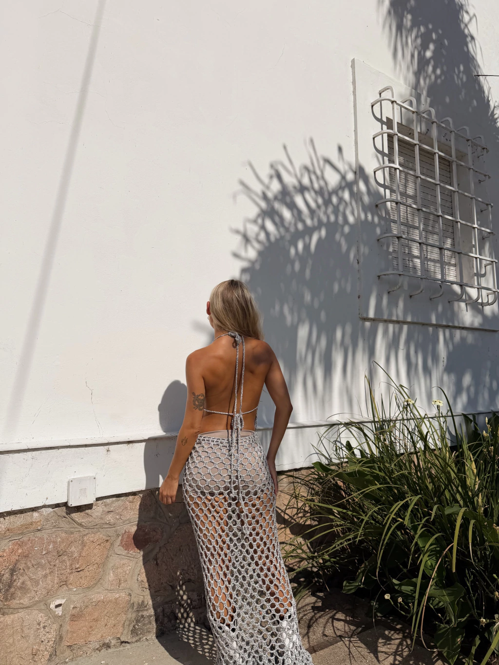Descubrí el Set tejido - Rio, un conjunto delicado y elegante que incluye pollera, top y manguitas. Hecho a mano en crochet con hilo de algodón, hilo de seda e hilo con detalles de lentejuelas, ofrece un brillo sutil ideal para ocasiones especiales. Su diseño fresco y sofisticado realza tu estilo con un toque artesanal único. Perfecto para quienes buscan comodidad y distinción en una sola prenda.